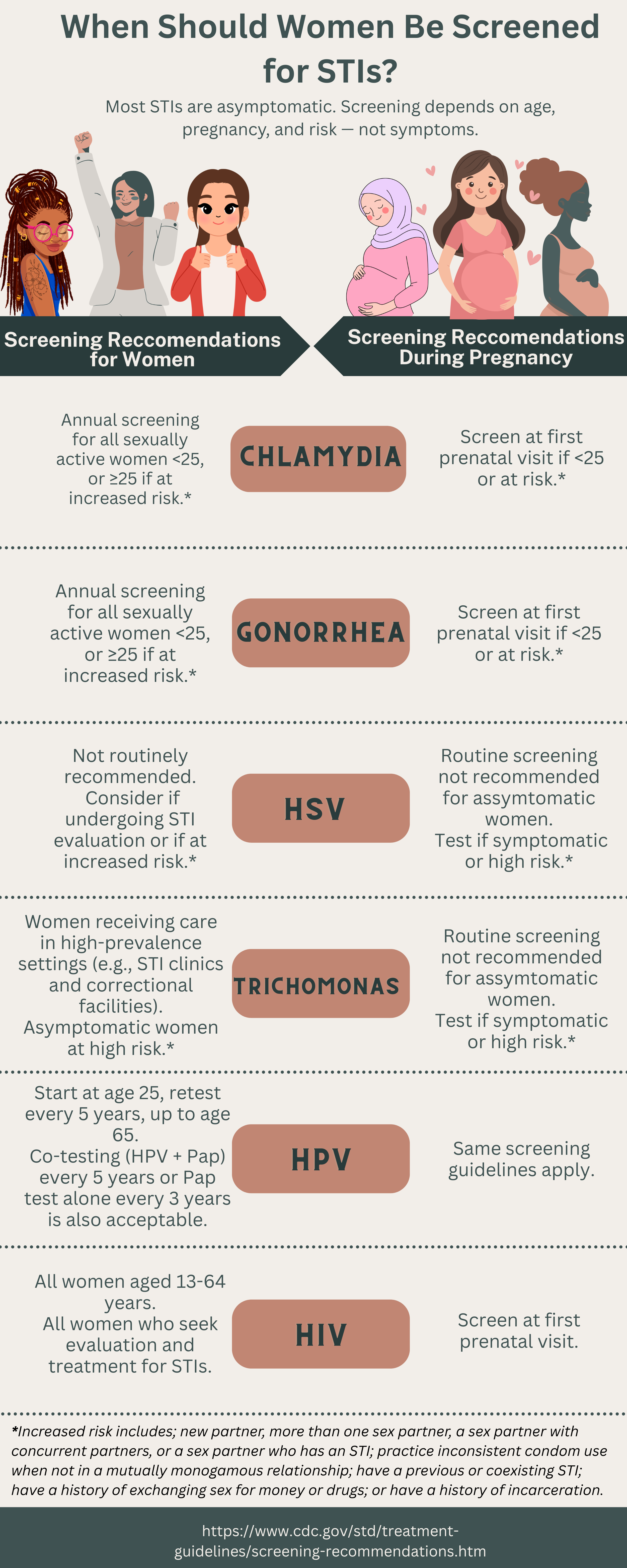 The figure “When Should Women Be Screened for STIs?” summarizes the current screening guidelines from the Centers for Disease Control and Prevention (CDC), including recommendations for women and pregnant women across the most common STIs. As shown in the figure, screening is based on age, pregnancy status, and risk factors, not the presence of symptoms. These guidelines make it clear that screening for many common STIs is intended to be routine and preventive, regardless of accessibility to testing centers and obvious signs of symptoms. This reflects a critical reality; because asymptomatic infections are common, preventive care systems must be designed to proactively identify them. When routine screening is inconsistent or inaccessible, silent infections cause long-term harm for women.